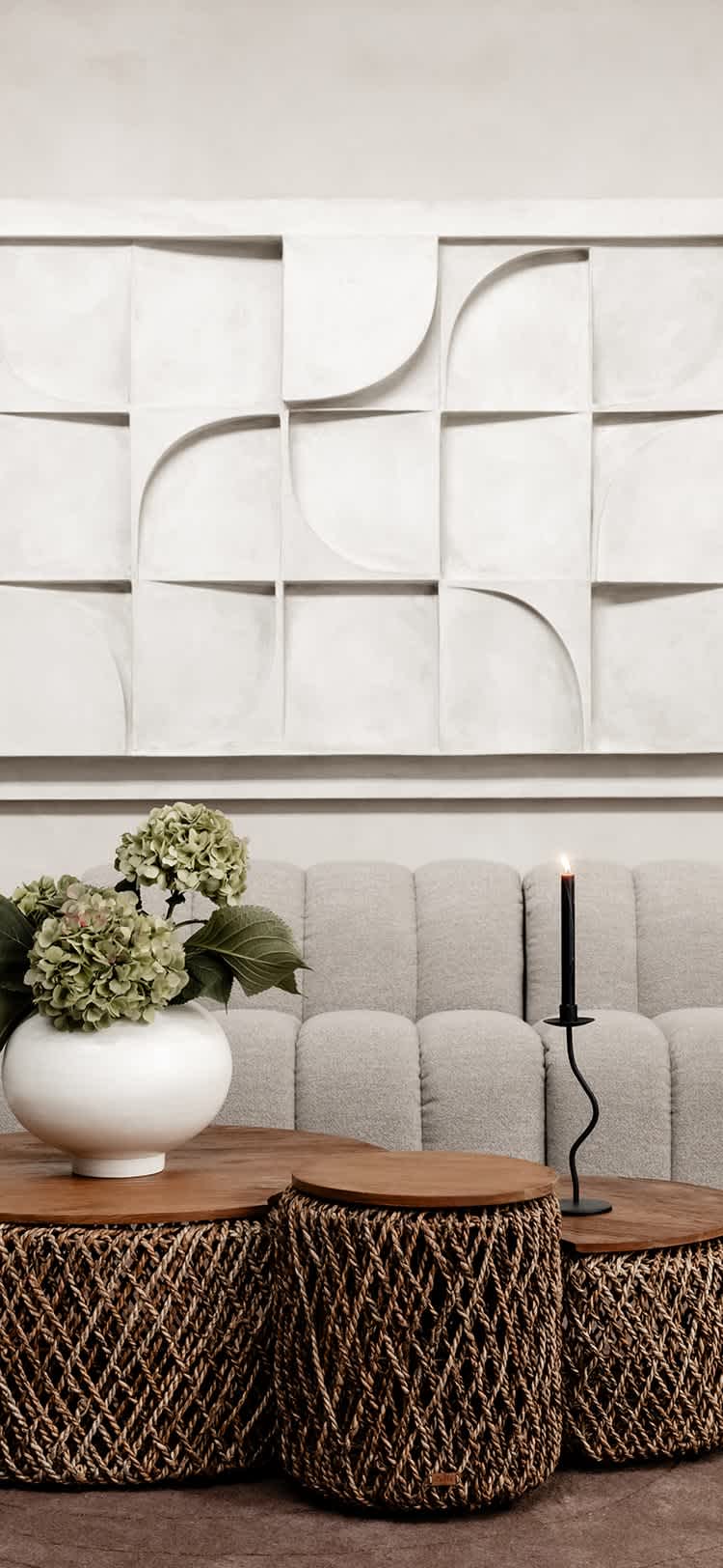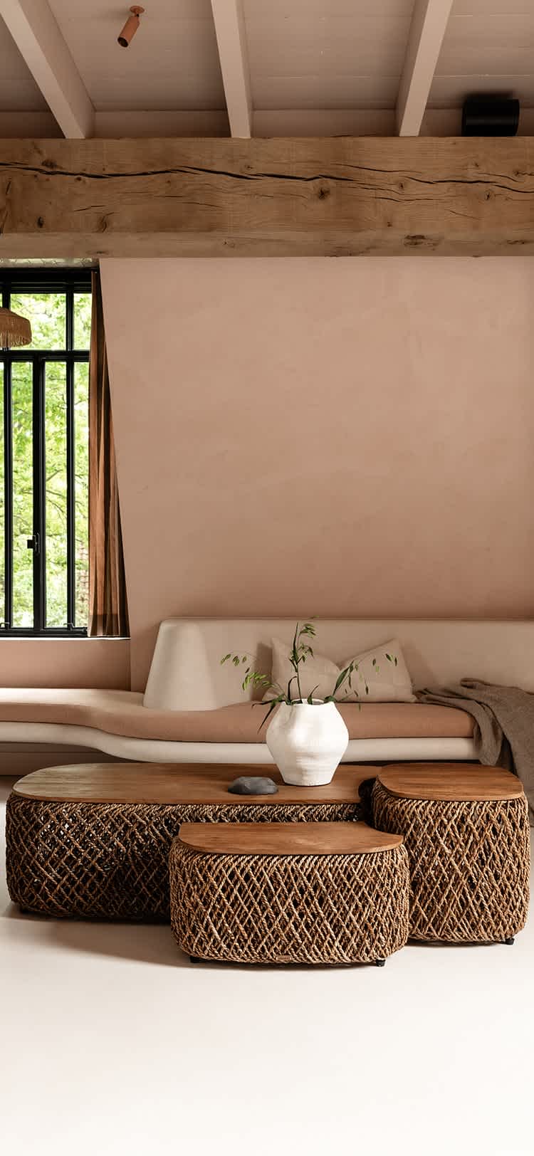 This collection features tables of various sizes, each showcasing a unique, playful design. The pieces double as tables and decorative elements, with some even transforming into stylish baskets. Crafted from eco-friendly materials, the tables boast hand-braided abaca fibers and tops made of reclaimed teak wood. The Knut Padi Coffee Table, in particular, subtly echoes the gentle curves of Indonesia's paddy fields, cleverly combining the look of multiple tables into one cohesive piece.