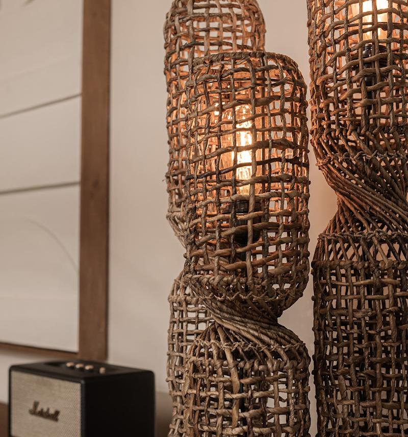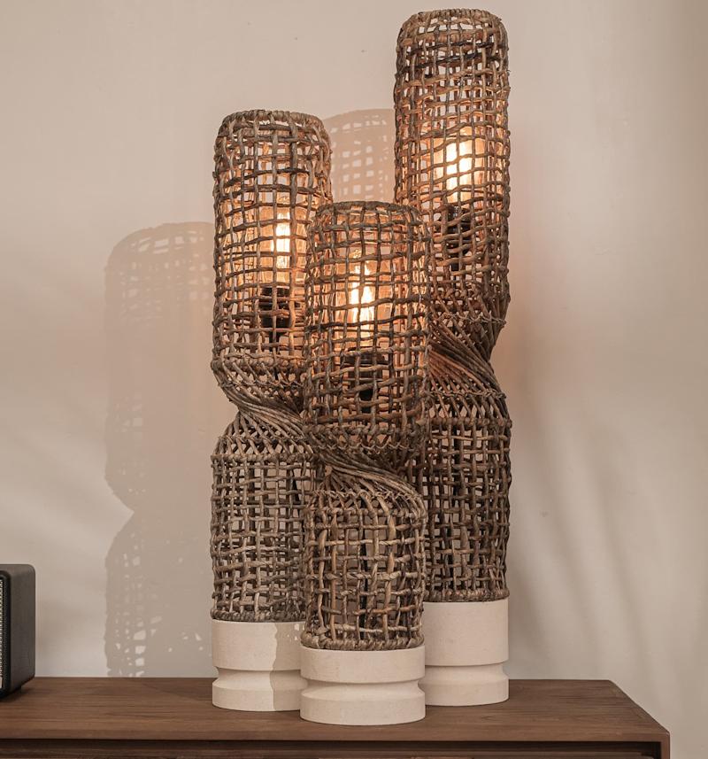 Twister Table Lampshades are freestanding table lamps fashioned in a ‘fish trap’ design using a metal framework and masterly wrapped in Abaca bark to create a rustic and pleasing weave appearance, the lamps are then pinched and twisted revealing stylish “twist detailing’ and sat upon a solid, hand turned sand stone base, providing both stability and safety.